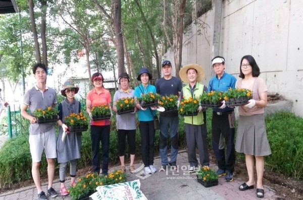 최근 경기 수원시 권선구 구운동에서는 단체원, 지역주민, 직원등 10여명이 합동으로 아파트 정류장 부근 화단의 잡초를 제거 하고 초화류를 식재했다. 사진은 관계자들이 초화류를 들고 기념촬영을 하는 모습.(사진제공=권선구청)