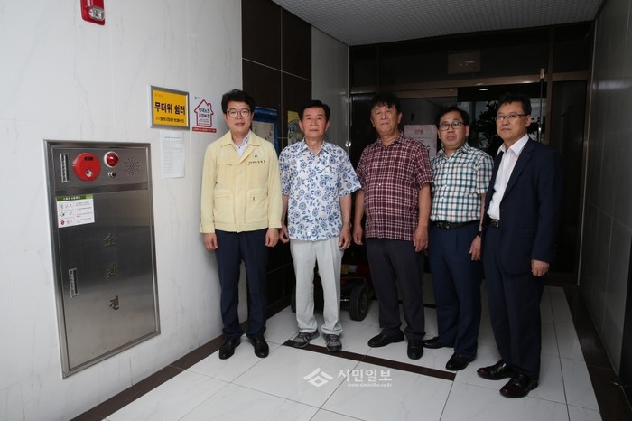 최근 정원오 서울 성동구청장은 무더위 쉼터로 지정된 금호4가동 서울숲푸르지오아파트 경로당을 방문해 노인들의 안부를 확인하고 냉방기 등 시설을 점검했다. 사진은 정 구청장(맨 왼쪽)과 관계자들이 기념촬영하는 모습.(사진제공=성동구청)