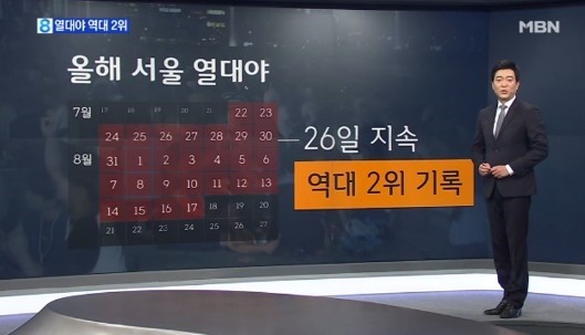 7일 기상청은 지난 7월 22일부터 서울 열대야 발생이 15일간 이어졌다며 이는 1994년에 이어 역대 2위라고 밝혔다.