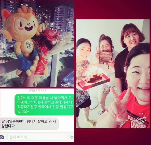 사진 속 윤진희는 동료들과 생일파티를 하고 있는 모습이다. 이외에도 리우데자네이루 올림픽 기념 인형과, 어머니와 주고 받은 문자 등이 눈길을 끌었다.