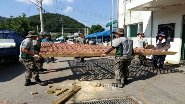 최근 경기 동두천시 소요동에서는 6321부대 장병 25여명과 중앙대학교 학생 20여명, 주민 등 70여명이 참여해 '안말 마을 건축 디자인 개선사업'을 추진했다. 사진은 장병 및 주민들이 건축 재료를 나르는 모습.(사진제공=동두천시청)