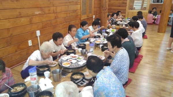 지난 6일 경북 구미시에 소재한 엉클권닭갈비에서 양포동 거주 홀몸노인 50여명에게 한방삼계탕을 대접했다. 사진은 이날 행사에 참석한 노인들이 식사하는 모습.(사진제공=구미시청)