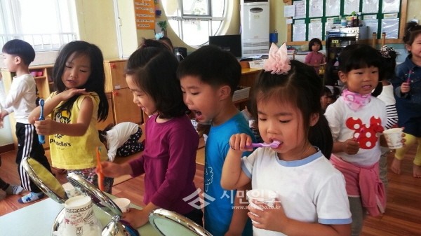 인천 강화군이 오는 10월까지 지역내 어린이집과 유치원 33개 기관의 1200명의 아동을 대상으로 실시하는 ‘찾아가는 치카푸카’ 구강보건 교육에 참가한 한 유치원에서 아이들이 거울을 보며 칫솔질을 하고 있다.(사진제공=강화군청)