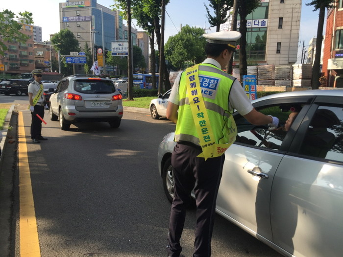 인천남동경찰서는 8일 길병원사거리에서 교통안전계, 남동모범운전자회 등 30여명과 함께 출근길 시민, 휴가를 떠나는 피서객을 대상으로 음주운전 단속을 실시했다.(사진제공=인천남동경찰서)