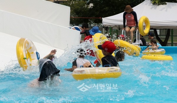 폭염이 이어진 지난 8일 오후 대구시 중구 대봉교 일대 신천 물놀이장을 찾은 학생들이 즐겁게 물놀이를 하며 더위를 식히고 있다.