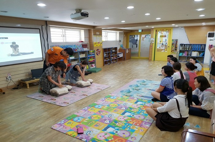지난 5일 서울 은평소방서는 지역내 예나 어린이집을 방문해 지도교사들을 대상으로 심폐소생술 교육을 실시했다. 사진은 교사들이 심폐소생술 실습을 하는 모습.(사진제공=은평소방서)
