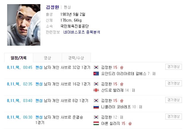 김정환은 11일(이하 한국시간) 2016 리우 올림픽 남자 사브르 개인전 아론 칠라지(26·헝가리)와의 4강전에서 12-15로 패했다.