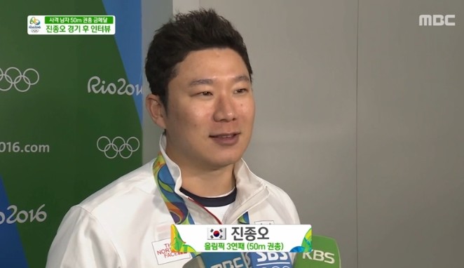 진종오는 11일(한국시간) 리우데자네이루 데오도르 올림픽 슈팅 센터에서 열린 사격 남자 50m 권총 대회에서 193.7점으로 베트남의 후앙 수안 빈 선수를 꺾고 금메달을 획득했으며 이는 한국 선수 최초 올림픽 3회 연속 금메달이다.