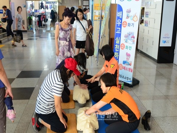 지난 10일 서울 영등포소방서는 영등포구민체육센터 실내수영장을 찾아가 여름철 물놀이 안전사고 방지를 위한 '119소소심 체험행사'를 실시했다. 사진은 주민들이 심폐소생술 실습을 하는 모습.(사진제공=영등포소방서)