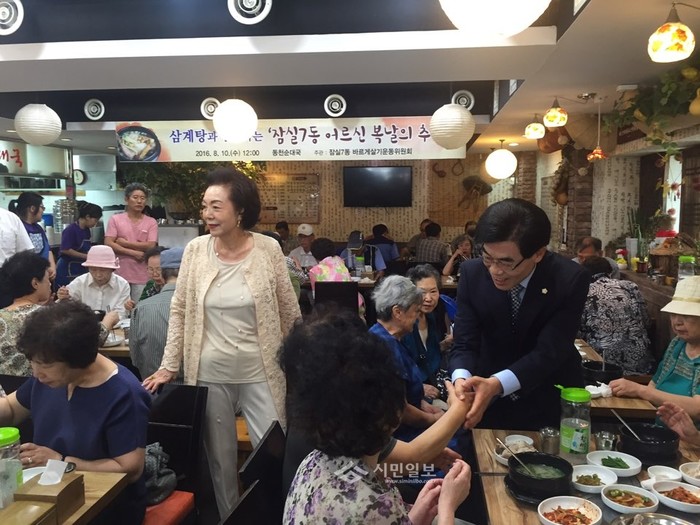 지난 10일 안성화 서울 송파구의장은 잠실7동 동천순대국에서 열린 '삼계탕과 함께하는 복날의 추억' 행사에 참석했다. 사진은 안 의장(오른쪽)이 노인들과 악수하는 모습.(사진제공=송파구의회)