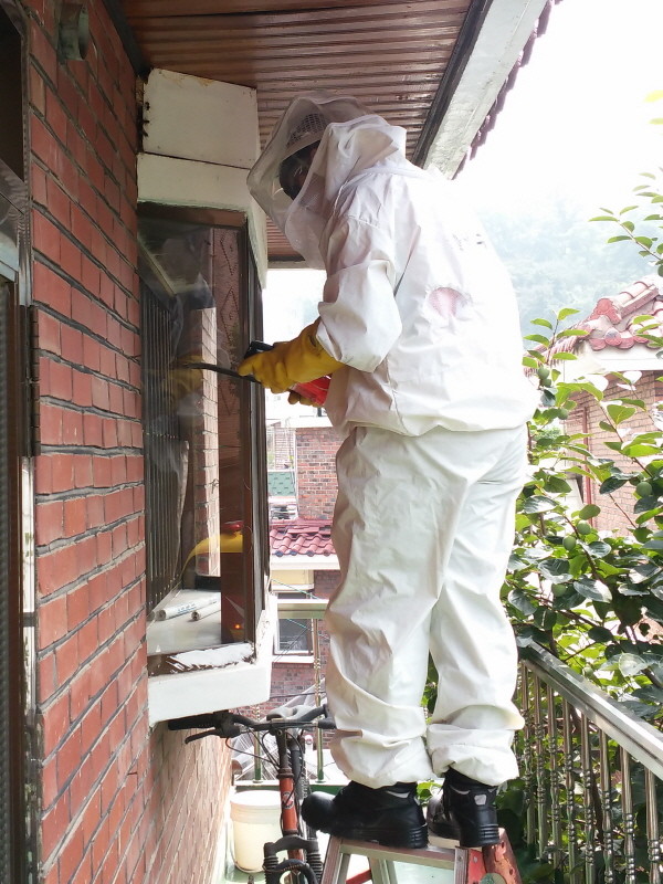 지난 10일 서울 관악소방서는 봉천동에 거주하는 구민의 신고를 받아 벌집제거 구조출동을 진행했다. 사진은 출동한 소방대원이 말벌을 제거하는 모습.(사진제공=관악소방서)