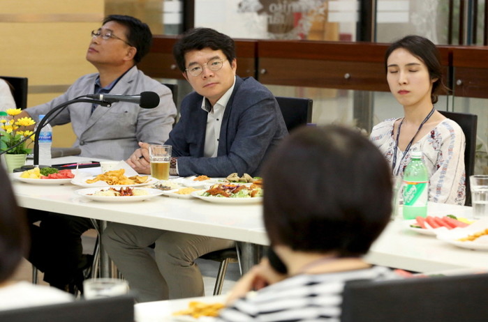 지난 10일 정원오 성동구청장은 세무직 직원들과의 허심탄회한 소통을 위한 ‘성동가족 소통데이’를 진행했다. 사진은 정 구청장(가운데)이 직원의 이야기를 경청하고 있는 모습.(사진제공=성동구청)