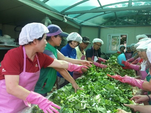 최근 충남 아산시 새마을회는 마을지도자 아산시협의회와 새마을부녀회 주관으로 시 새마을회관에서 여름방학철 어려운 이웃들에게 직접 만든 밑반찬을 전달하는 사랑의 반찬 나눔 행사를 개최했다. 사진은 봉사자들이 채소를 손질하는 모습.(사진제공=아산시청)