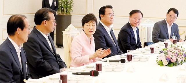 박근혜 대통령이 11일 낮 청와대에서 열린 새누리당의 새 지도부 초청 오찬에서 인사말을 하고 있다. 이날 회동에는 이 대표를 비롯해 조원진·이장우·강석호·최연혜 최고위원, 유창수 청년 최고위원 등 지난 전당대회에서 선출된 신임 지도부와 정진석 원내대표, 김광림 정책위의장이 참석했다.