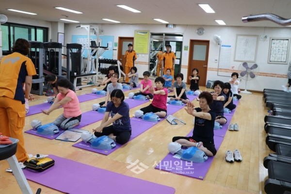 12일 경기 군포소방서는 오금동 주민센터에서 주민 대상으로 심폐소생술 교육 등 소소심 교육을 진행했다. 사진은 주민들이 심폐소생술 실습을 하는 모습.(사진제공=군포소방서)