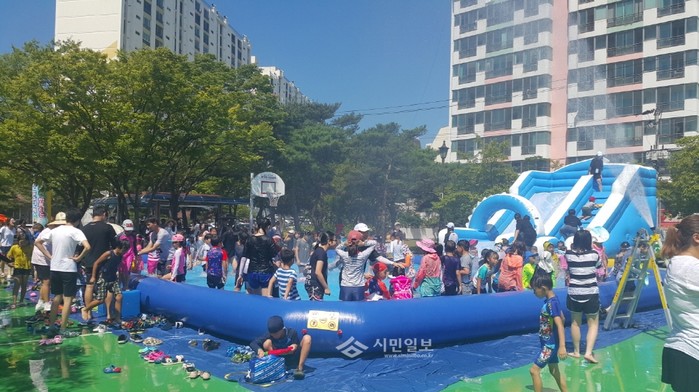 최근 경북 구미시와 구미시지역사회보장협의체는 형곡공원에서 지역주민과 자원봉사자 등이 참여한 가운데 '가족과 함께하는 도심 속 물놀이 페스티벌'을 주제로 '찾아가는 주민서비스 한마당'을 운영했다. 사진은 주민들이 물놀이를 하는 모습.(사진제공=구미시청)