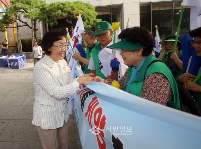 12일 광복절 71주년을 맞아 서울 강남구청역에서 ‘태극기 달기 및 에너지절약 캠페인’을 펼치고 있는 현장을 방문한 신연희 구청장(왼쪽)이 플렌카드를 들고 캠페인 문구를 외치고 있는 새마을운동 회원들을 격려하고 있다.(사진제공=강남구청)