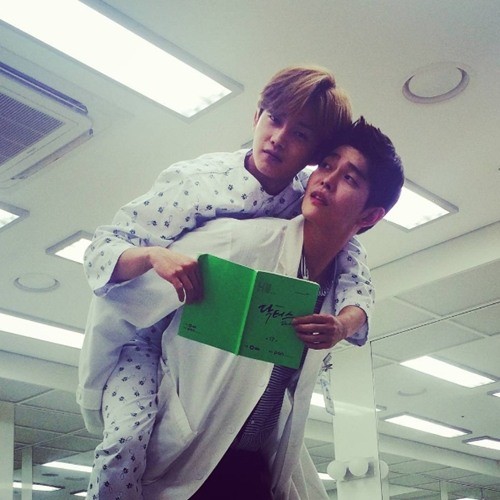 공개된 사진 속에는 김민석이 윤균상의 등에 업힌 모습이 담겨있다. 특히 김민석은 '닥터스' 대본을 손에 꼭 쥐고 있어 눈길을 끌었다.