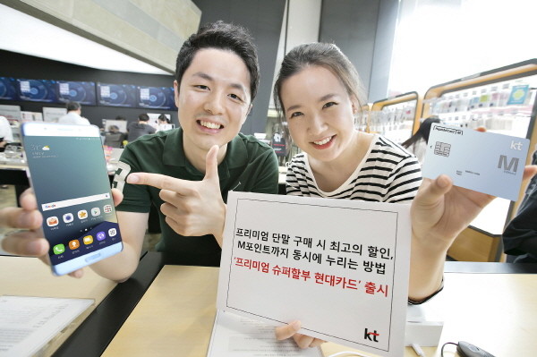오는 19일 출시되는 갤럭시노트7를 포함한 모든 KT 단말기를 프리미엄 슈퍼할부카드로 구매 시 최대 48만원에서 36만원(24개월)의 할인은 물론, KT만의 단말 할인 프로그램인 포인트파크(고객 보유 카드사 포인트) 및 멤버십 포인트(할부원금의 5%, 최대 5만원)로 함께 할인받을 수 있어 프리미엄 단말도 저렴하게 구매가 가능하다.