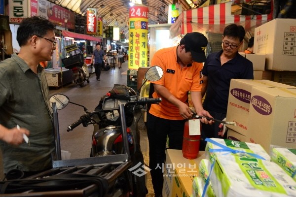 지난 12일 서울 영등포소방서는 최근 발생한 영등포 전통시장 일대 화재 발생과 관련해 화재저감·예방을 위한 현지적응훈련을 실시했다. 사진은 소방관이 상인에게 소화기 사용법에 대해 설명하는 모습.(사진제공=영등포소방서)