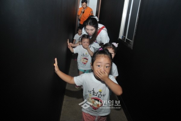 16일 서울 관악소방서는 지역내 예쁜어린이집 어린이를 대상으로 '소방안전교육'을 실시했다. 사진은 이날 교육에 참여한 어린이들이 화재대피 체험을 하는 모습.(사진제공=관악소방서)