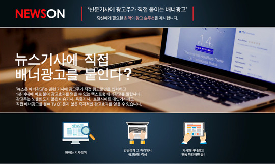 뉴스온배너는 광고주가 실시간 이슈기사나 내 기업, 내 제품과 관련된 기사를 검색해서 해당 기사 하단에 배너광고를 직접 만들어 바로 붙일 수 있는 새로운 개념의 배너광고 솔루션이다.