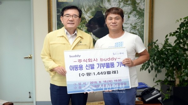 지난 16일 서울 동대문구 장안동에 위치한 (주)버디는 생활이 어려운 저소득층 어린이들을 위해 써 달라며 구에 아동용 신발 1449켤레를 기탁했다. 사진은 유덕열 구청장(왼쪽)과 관계자가 기념촬영하고 있는 모습.(사진제공=동대문구청)