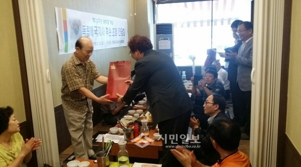 최근 서울 은평구 역촌동에서는 '광복 제71주년'을 맞아 지역내 식당에서 '독립애국지사 후손 초청 간담회'를 개최했다. 사진은 관계자가 애국지사 후손에게 기념품을 전달하는 모습.(사진제공=은평구청)