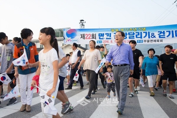 지난 15일 경북 구미시 무을면은 면사무소 앞에서 광복 제71주년 기념 '제22회 무을면민 건강달리기·걷기대회'를 개최했다. 사진은 남유진 시장(가운데)이 주민들과 함께 걷고 있는 모습.(사진제공=구미시청)