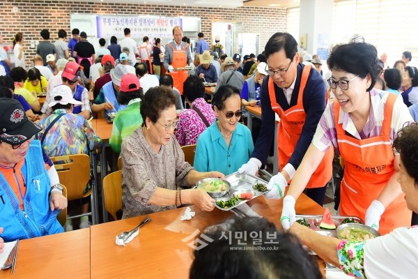 지난 16일 홍미영 인천 부평구청장은 말복을 맞아 구 노인복지관 3층 식당에서 열린 ‘말복맞이 복달임 행사’에 참석, 배식활동을 했다. 사진은 홍 구청장(맨 오른쪽)이 노인들에게 삼계탕을 배식하는 모습.(사진제공=인천 부평구청)