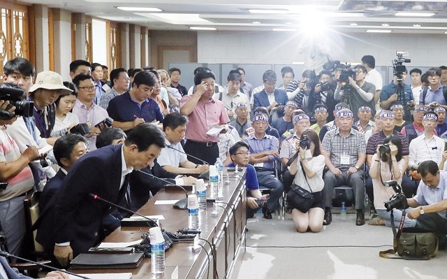 한민구 장관(앞줄 왼쪽)이 17일 오후 경북 성주군청을 찾아 사드(고고도미사일방어체계) 배치와 관련해 주민들과 간담회를 하기 전 인사하고 있다.