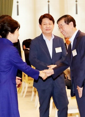 박근혜 대통령이 17일 청와대에서 열린 전국 시도지사 오찬에서 박원순 서울시장과 인사하고 있다.