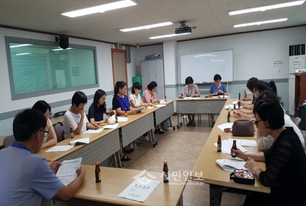 지난 17일 경기 수원시 팔달구 우만2동 새마을부녀회는 동주민센터 3층 명품실에서 '8월 정기 월례회의'를 개최했다. 사진은 회의에 참여한 관계자들이 토론하는 모습.(사진제공=팔달구청)