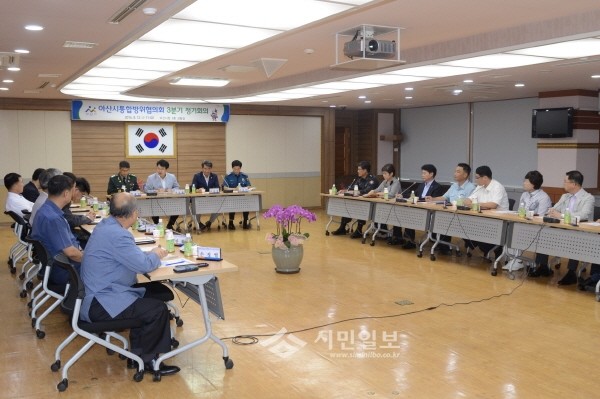 충남 아산시는 최근 시청 상황실에서 통합방위협의회 의원, 군 관계자 등 40여명이 참석한 가운데 ‘2016 을지연습’의 성공적 추진을 위한 시통합방위협의회 회의를 개최했다. 사진은 복기왕 시장(가운데 왼쪽에서 두 번째)과 관계자들이 회의하는 모습.(사진제공=아산시청)