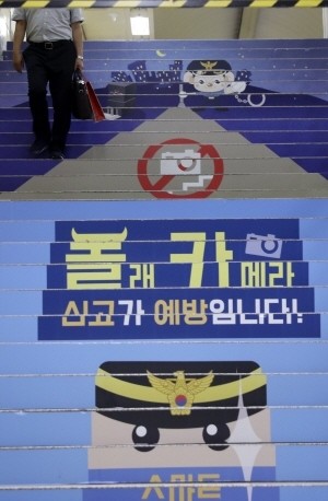 경찰이 몰카 범죄가 자주 일어나는 지하철역 계단에서 몰카 근절 캠페인을 벌인다. 서울지방경찰청은 지하철 5∼8호선을 운영하는 서울도시철도공사와 함께 가산디지털단지·광화문·공덕역에 '몰카 아웃 계단'을 3주 동안 운영한다고 18일 밝혔다. 사진은 이날 오후 공덕역에 설치된 몰카 아웃 계단.
