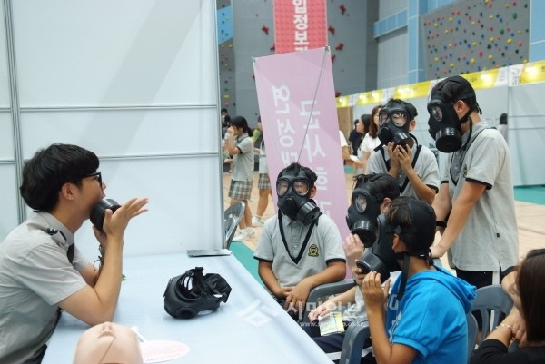 최근 경기도가평교육지원청은 한석봉체육관·가평청소년문화의집·여성회관 일대에서 지역내 중·고등학생 2700여명이 참여하는 '2016 가평 진로체험박람회'를 개최했다. 사진은 학생들이 방독면 체험을 해보고 있는 모습.(사진제공=경기도가평교육지원청)