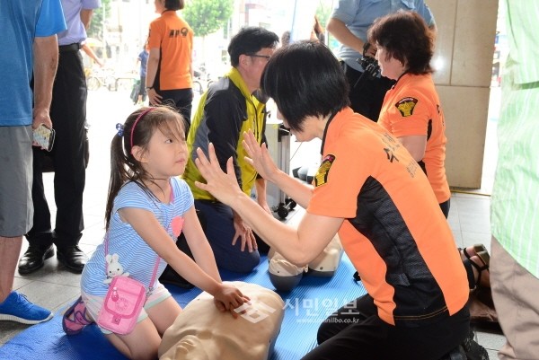 18일 서울 영등포소방서는 롯데 백화점 및 영등포역 등 이용객을 대상으로 '찾아가는 119소소심 야외 체험행사'을 운영 했다. 사진은 소방서 관계자들이 참여자들에게 심폐소생술 교육을 하는 모습.(사진제공=영등포소방서)