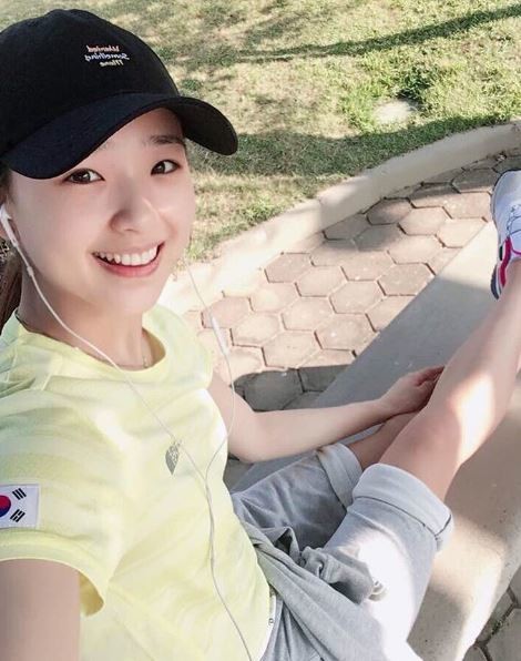 손연재는 사진 속에서 조깅을 하는 듯한 모습을 보였고 한 손에 사진을 들고 밝은 미소를 짓고 있다.
