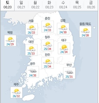 바다의 물결은 남해와 동해상에서 최고 2.5m로 조금 높게 일겠다.처서 절기가 있는 다음 주에도 서울의 낮 기온이 33도 안팎까지 오르는 등 폭염이 계속되겠다.
