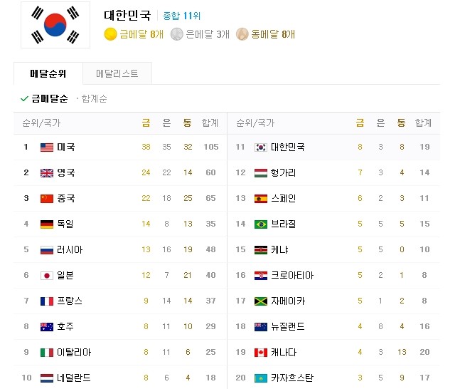 대한민국은 현재 금메달 8개, 은메달 3개, 동메달 8개로 11위다,