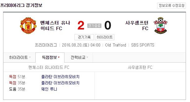 맨유는 20일(한국시간) 영국 맨체스터에서 열린 2016-2017 프리미어리그 1라운드 사우스햄튼와의 홈경기에서 2-0의 스코어로 승리했다.