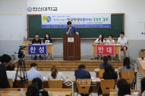 최근 경기 오산시가 전국적인 토론문화 확산을 위해 개최한 '제2회 오산시 전국 학생토론대회'가 오산중학교와 한신대학교에서 학생들의 뜨거운 참여 속에 막을 내렸다. 사진은 중등부 결승이 진행되고 있는 모습.(사진제공=오산시청)
