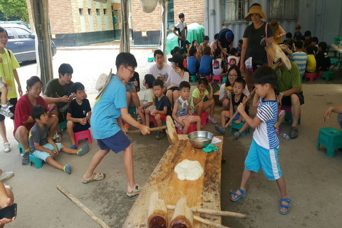 지난 20일 은평구는 지역내 영유아 가족을 대상으로 경기도 양평군 외갓집 체험마을에서 '한여름의 영유아 가족캠프'를 개최했다. 사진은 참가 어린이들이 인절미 떡메치기 체험을 하고 있는 모습.(사진제공=은평구청)