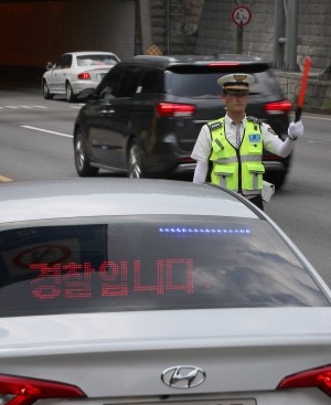 22일 서울내부순환도로 홍지문터널 앞에서 서울지방경찰청 도시고속순찰대 소속 경찰이 암행순찰차를 타고 법규 위반 차량에 대한 계도 및 단속 시연을 진행하고 있다. 경찰은 9월 1일부터 올림픽대로나 강변북로, 내부순환로 등 서울시내 자동차전용도로에서 암행순찰차를 확대 운영한다.