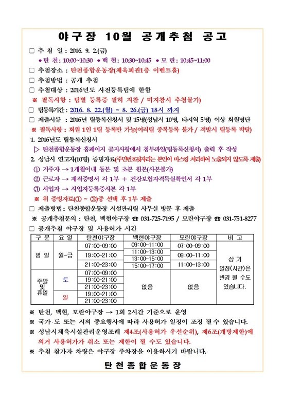 탄천종합운동장 측은 23일 홈페이지에 야구장 팀 등록에 관한 자세한 사항을 공개했다.