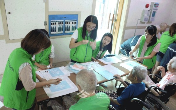 최근 경기 안성시자원봉사센터의 제11기 가족봉사단은 공도읍에 위치한 기쁨의 동산 요양원에서 노인들과 함께 손수건을 만들고 다과를 나누는 봉사활동을 실시했다. 사진은 봉사단원들이 노인들과 손수건을 만드는 모습.(사진제공=안성시청)
