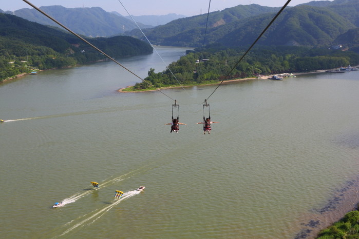 | 남이섬과 자라섬을 잇는 레저시설인 '짚와이어'를 탄 관광객들이 양팔을 펼치고 속도를 즐기고 있다. | ||