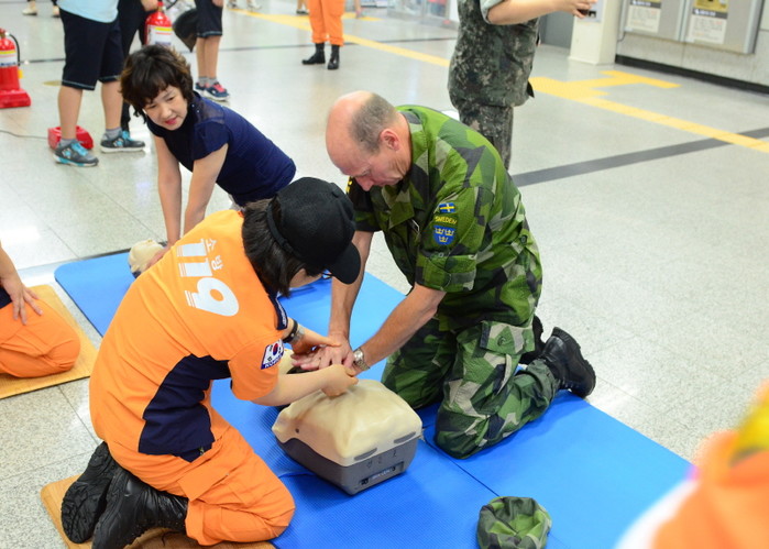 지난 23일 서울 영등포소방서는 여의도역에서 찾아가는 119소·소·심 이동단을 운영했다. 사진은 교육에 참여한 주민 및 외국인이 심폐소생술 실습을 하는 모습.(사진제공=영등포소방서)