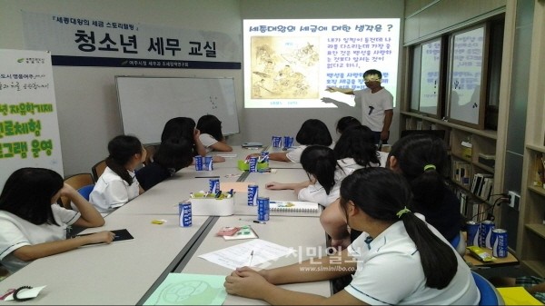 24일 경기 여주시는 시청 내 세종사랑방에서 청소년을 대상으로 '세종대왕의 세금 스토리텔링' 청소년 세무교실을 진행했다. 사진은 '세종조세연구회' 회원이 학생들에게 강의하는 모습.(사진제공=여주시청)