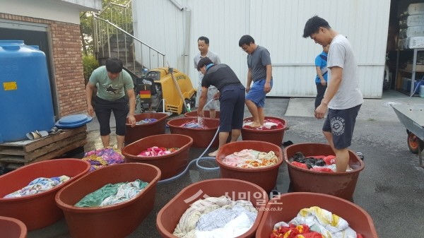 최근 경기 포천시 일동면 지역사회보장협의체는 거동이 불편해 이불세탁을 할 수 없는 홀몸노인·장애인 가구를 선정해 '이불세탁 봉사'를 실시했다. 사진은 협의체 회원들이 빨래를 하고 있는 모습.(사진제공=포천시청)